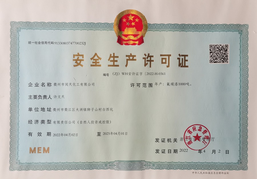 Wentian Chemical Safety Permission Certificate